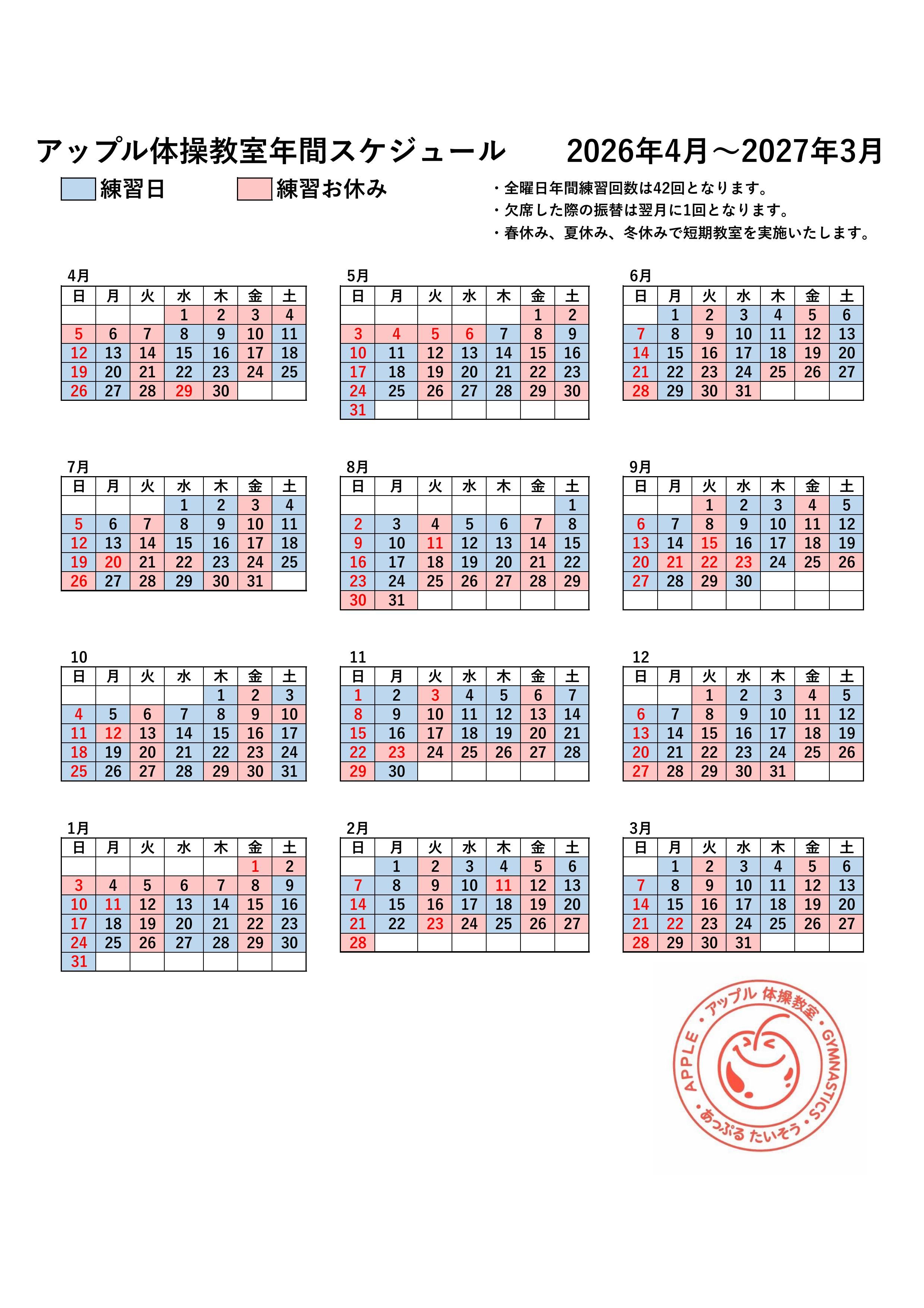 令和8年度(令和8年4月〜令和9年3月)の年間教室スケジュールとなります。